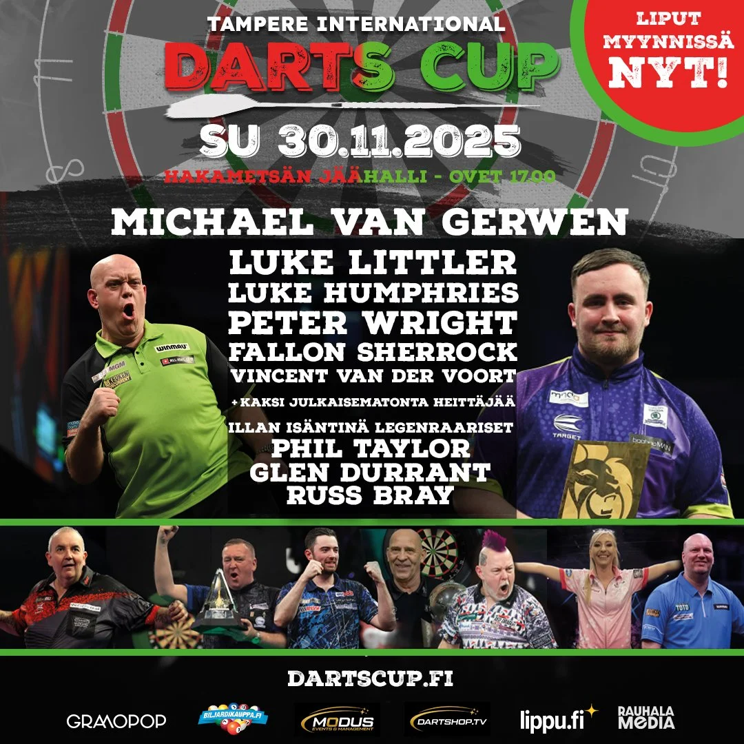 Helsingissä menestyksekkäästi viime vuoden lopulla järjestetty Helsinki International Darts Cup siirtyy Tampereelle. Hakametsän jäähallissa sunnuntaina 30. marraskuuta järjestettävään Tampere International Darts Cupiin on saatu darts-maailman kerma. Mukana ovat mm. tänään toisensa Dartsin MM-finaalissa toisensa kohtaavat darts-sensaatio Luke Littler ja kolminkertainen dartsin maailmanmestari Michael Van Gerwen sekä maailmanlistan ykköspaikkaa pitävä vuoden 2024 maailmanmestari Luke Humphries. Kaikkiaan Tampere International Darts Cupissa heittää kahdeksan darts-tähteä. Kansainvälisen turnauksen tuomaroi Russ Bray ja illan isäntinä toimivat lajin suurimpiin legendoihin lukeutuva Phil Taylor sekä mm. TV-kommentaattorina monille tutuksi tullut GlenDurrant. Tampere International Darts Cupin liput tulevat myyntiin tiistaina 7. tammikuuta.